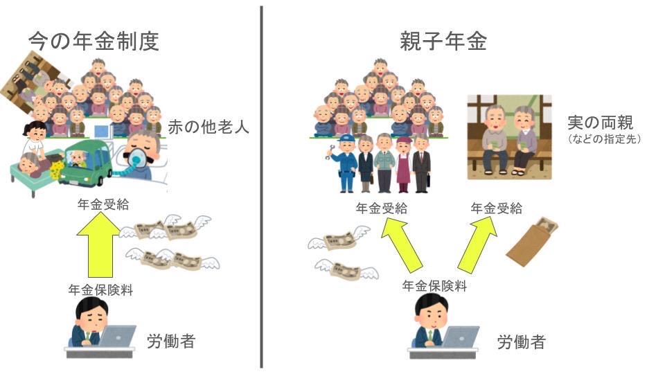 【親子年金制度のご提案】今の現役世代は、自分の親でもない沢山の他人老人の年金を賦課方式で仕送りする義務が発生している。支払い者と給付者の人口比バランスが完全にぶっ壊れてる。賦課方式を残すなら『ふるさと納税』のような感じで、年金支払いの半分は『実親への支払い』を選べる制度にすべき。親子の信頼関係があれば実親に支払うだろうし、毒親なら支払われない。親子の信頼関係のもとで産み育てるインセティブも出てくる。信頼関係を軸とした顔が見える家族の支え合いを取り戻すことが、一番の相互扶助であり、少子化対策です。